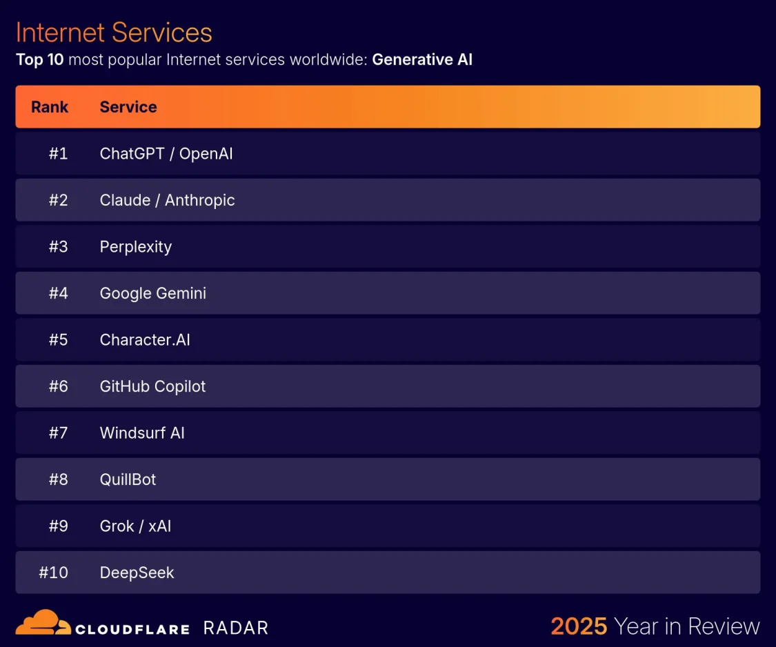 2025 年生成式 AI 的競爭更勝以往。ChatGPT 雖仍位居全球最受歡迎的 AI 服務,但整體榜單出現了劇烈的位移。Claude、Perplexity 等服務明顯提升市占,Google Gemini、Windsurf AI、Grok/xAI 以及中國的 DeepSeek 等新加入的服務,也都在短時間內推升大量使用與流量。