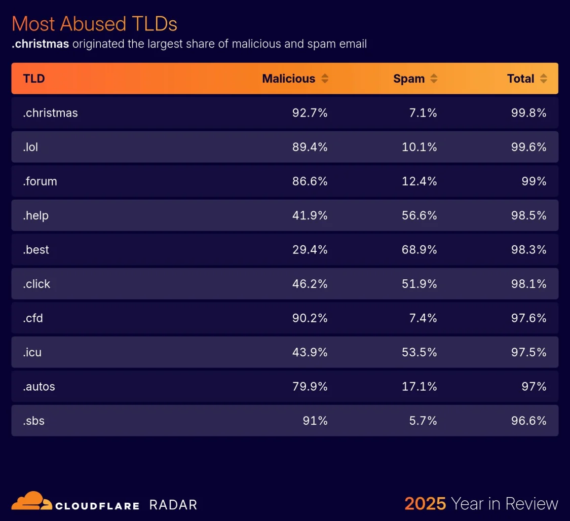在觀察寄件來源時,也呈現了明顯的風險集中。Cloudflare 指出,以 .christmas 與 .lol 為首的一些頂級網域,寄送的郵件中有非常高比例屬於垃圾郵件或惡意信件,顯示這些網域已成為攻擊者偏好的散佈渠道。這些看似無害的趣味頂級域名,反而因為缺乏管控而被迅速武器化,導致企業郵件系統與終端使用者暴露在更高風險中。